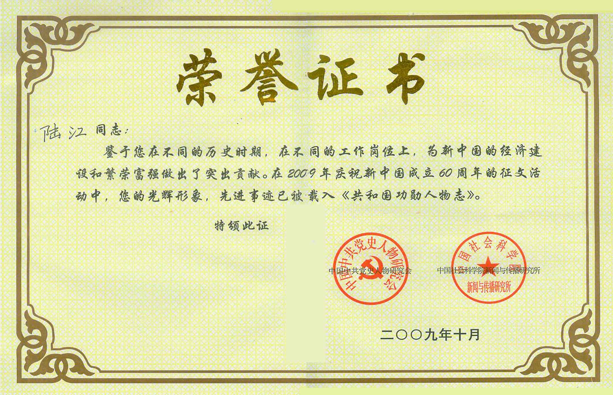 陸江的杰出貢獻被人民日報社評為先進個人